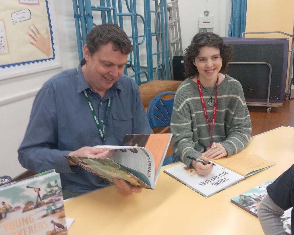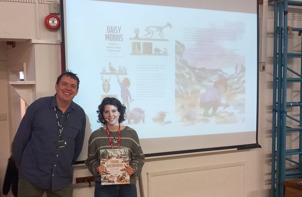 Daisy’s find inspired my book Young Discoverers – true tales of kids who made incredible discoveries. She is now twenty-two, and I was thrilled that she could join me yesterday at her old school Niton Primary, where her mum still teaches. In assembly, Daisy shared with us the full story of how she found the pterosaur and what happened afterwards.